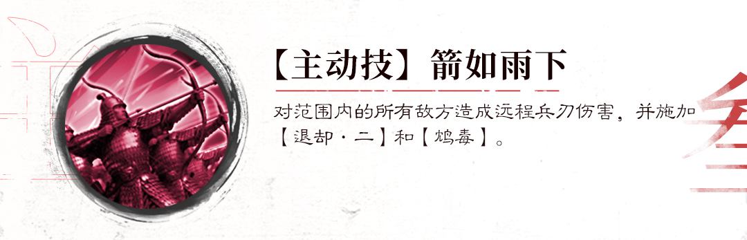 攻击目标范围内的所有敌人,造成远程兵刃伤害并施加减益效果。与“且战且退”相同,在造成远程AOE伤害的同时,能够对敌人施加【鸩毒】减益效果。