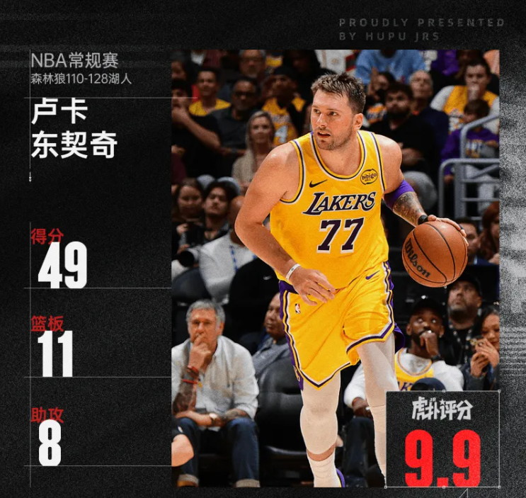 本场比赛,湖人球员卢卡-东契奇出战34分钟,23投14中,其中三分球12投5中,罚球19投16中,得到49分11篮板8助攻。