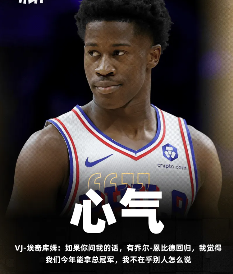 近日,76人球员VJ-埃奇库姆今日在一档节目中表示,只要乔尔-恩比德保持健康,76人本赛季就能夺冠。