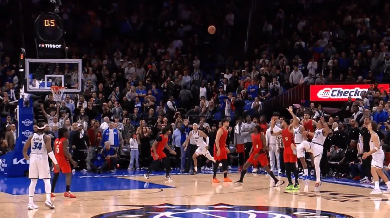 在比赛最后1.9秒两队打平,贝恩接球运了一下随后极限出手干拔三分球进,魔术绝杀开拓者。