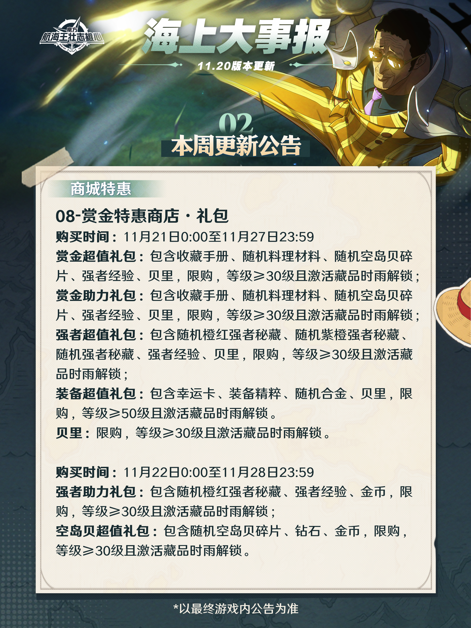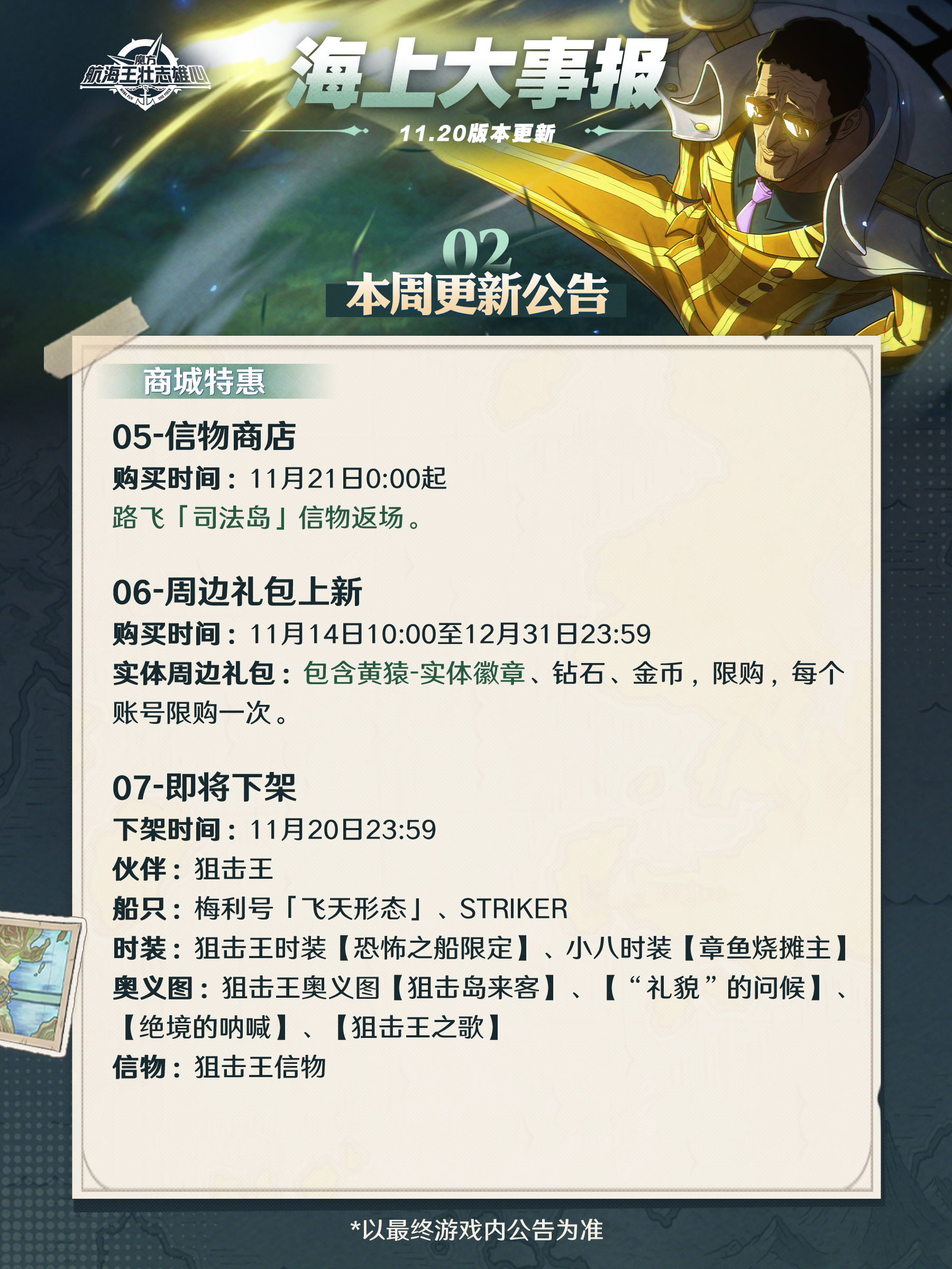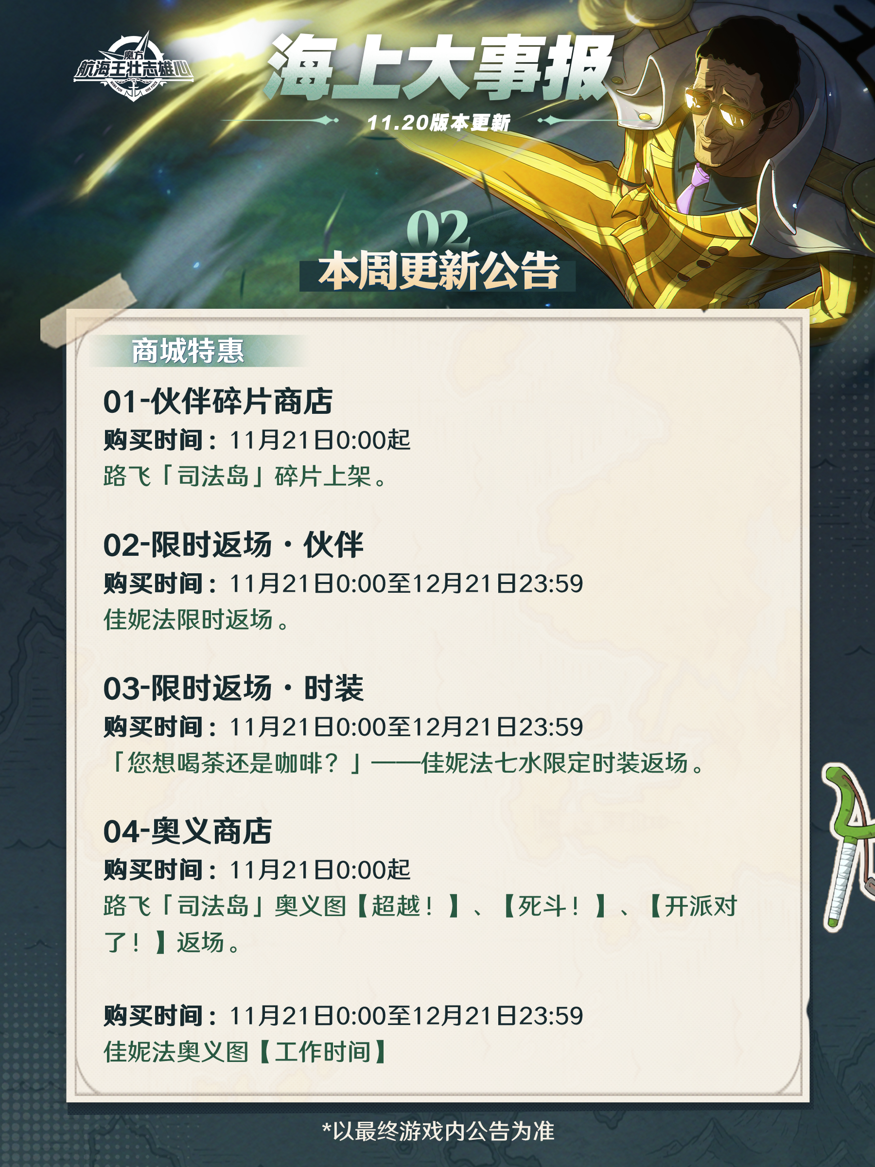 路飞「司法岛」碎片11月21日上架,佳妮法及其奥义图同日返场。