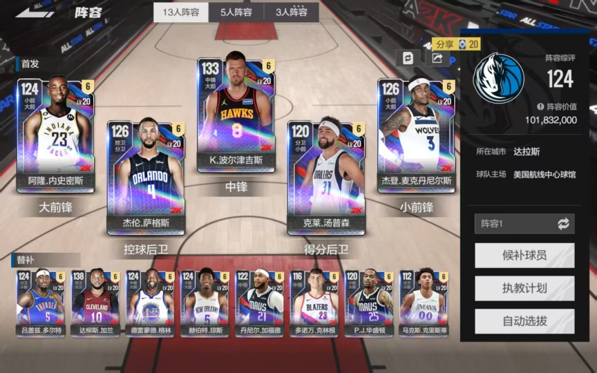 杰登本赛季开赛表现也非常不错,很有可能未来球员数据不会削弱的情况下,迎来一个小加强,推荐使用进攻篮板型的硬C搭配这套阵容。推荐使用到的是杜伦或者哈滕施坦担任首发中锋,提高篮板球,以保证射手的容错