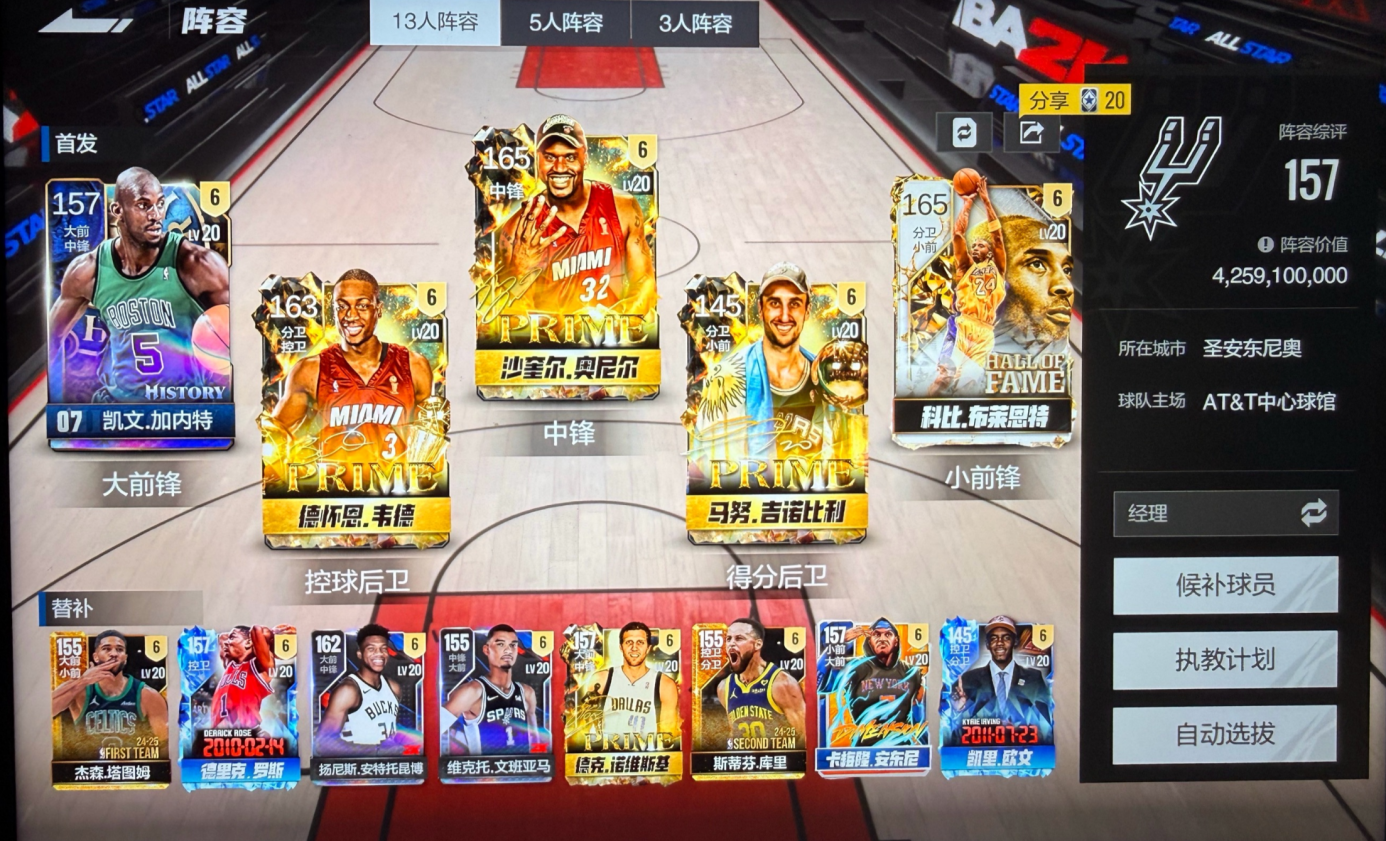 如果是打持球档的话,推荐用首发库里、科比、塔图姆、奥尼尔或者加内特的阵容,使用奥尼尔的话,会在二次进攻方面效率更高,终结更厉害。加内特在协防和挡拆后的切入能力大于奥尼尔。具体使用谁打中锋,要看打法。