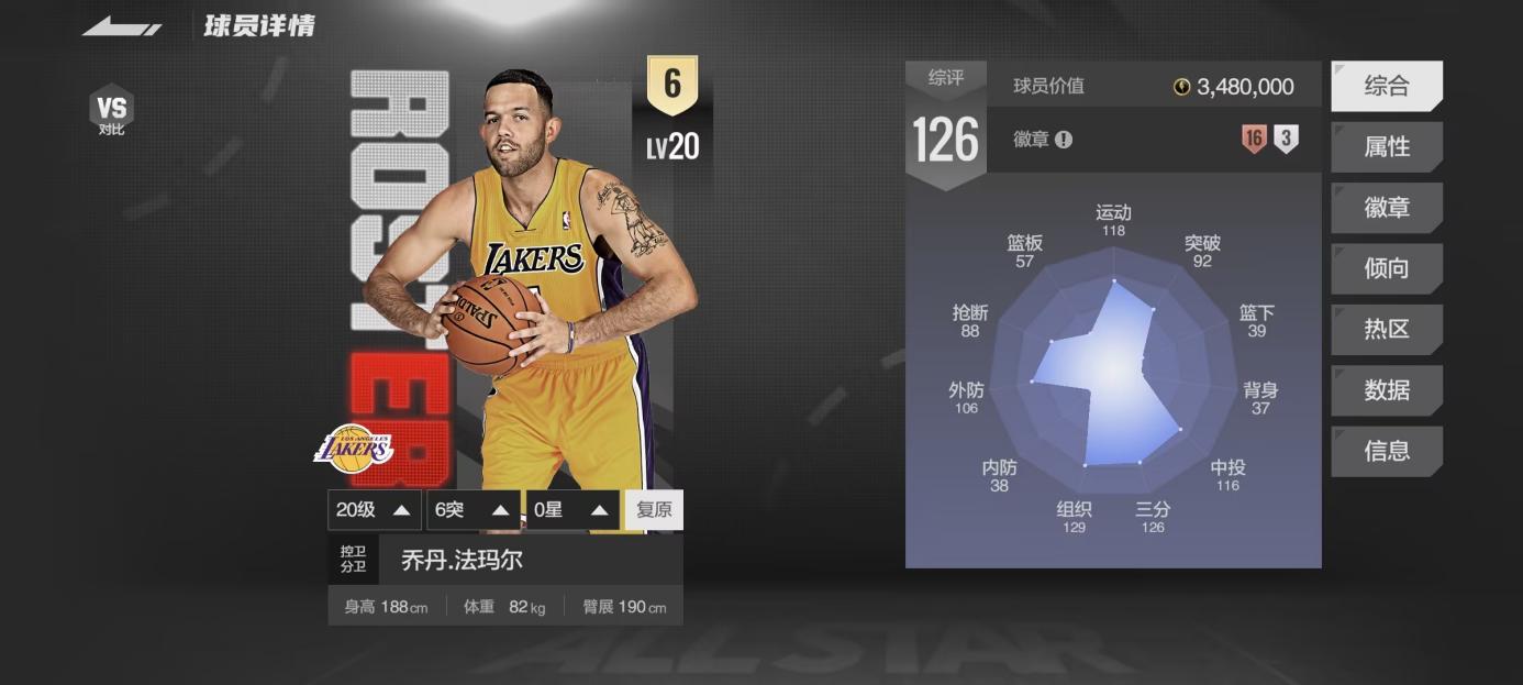 特雷西:替补的话可以跟首发去打一个差异化,米西是没有投篮的,所以我建议从首发的PF拿到替补的中锋。替补PG的位置上可以选择也是性价比非常不错的一名球员,叫乔丹.法玛尔,目前300W满突。有着非常不错的这个投射徽章和组织徽章,手感也很好,可以自己持球进攻