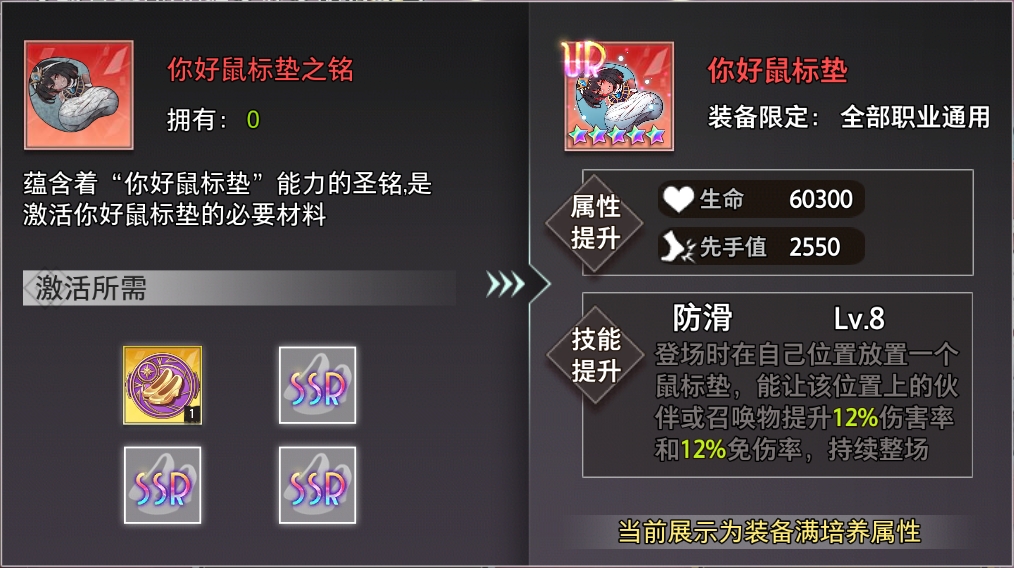 登场时在自己位置放置一个鼠标垫,能让该位置上的伙伴或召唤物提升12%伤害率和12%免伤率,持续整场