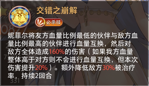 妮菲尔将友方血量比例最低的伙伴与敌方血量比例最高的伙伴进行血量互换,然后对敌方全体造成160%的伤害(如果我方血量整体高于对方则不会进行血量互换,但本次伤害提升20%)。额外降低敌方30%被治疗率,持续2回合