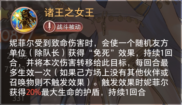 妮菲尔受到致命伤害时,会使一个随机友方单位(除队长)获得“免死”效果,持续1回合,并将本次伤害转移给此目标,每回合最多生效一次(如果已方场上没有其他伙伴或召唤物则不触发效果)。触发效果时妮菲尔获得20%最大生命的护盾,持续1回合