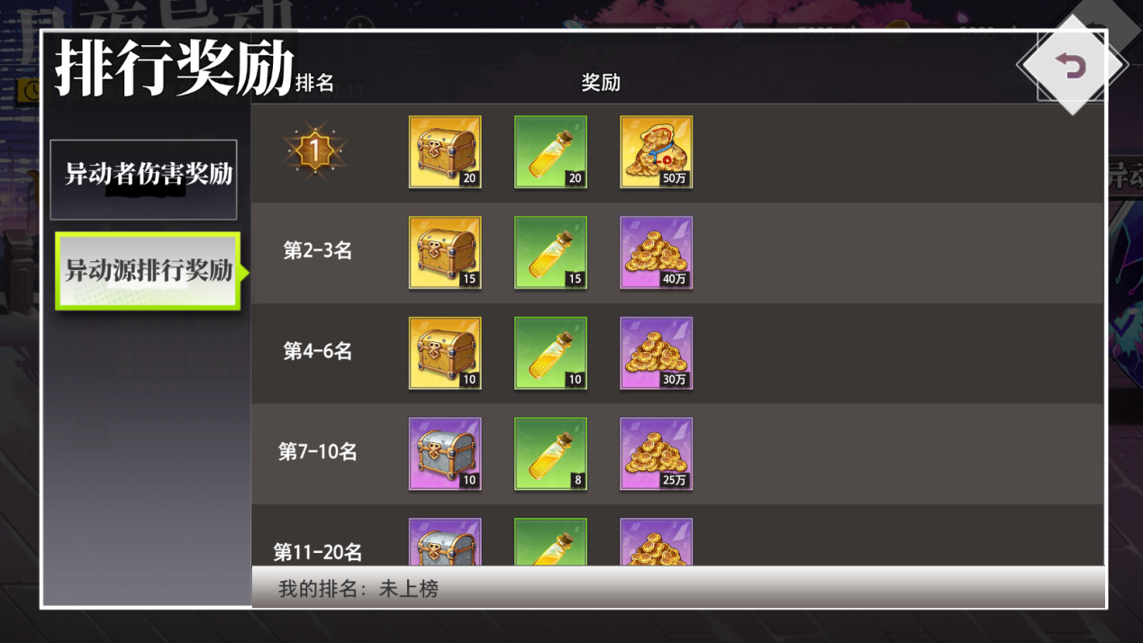 根据队长挑战异动者累计的伤害领取对应的奖励,排名前20玩家可挑战异动源,异动源挑战将在异动者挑战结算后开启。
