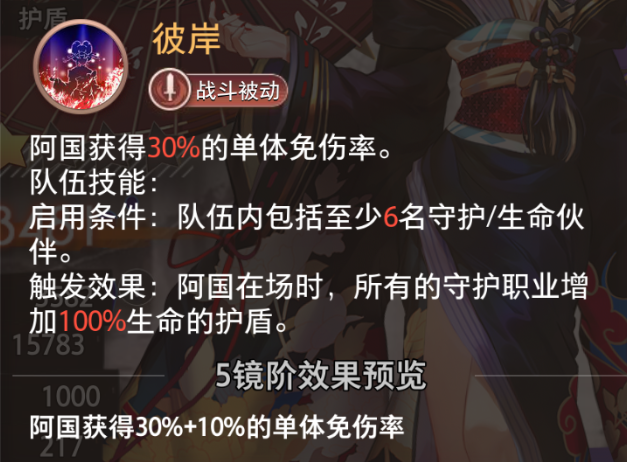 触发效果:阿国在场时,所有的守护职业增加100%生命的护盾。