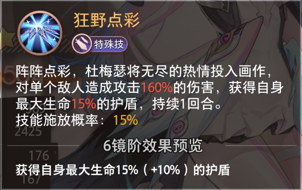 阵阵点彩,杜梅瑟将无尽的热情投入画作,对单个敌人造成攻击160%的伤害,获得自身最大生命15%的护盾,持续1回合。