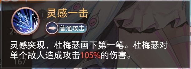 灵感突现,杜梅瑟画下第一笔。杜梅瑟对单个敌人造成攻击105%的伤害。