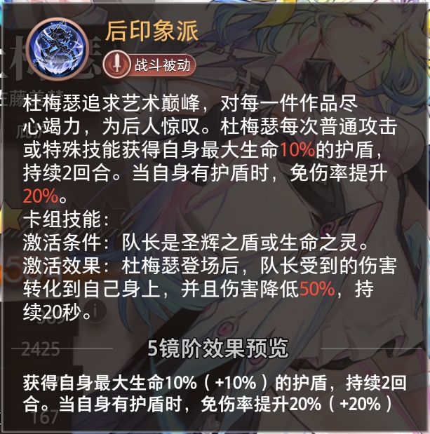 杜梅瑟追求艺术巅峰,对每一件作品尽心竭力,为后人惊叹。杜梅瑟每次普通攻击或特殊技能获得自身最大生命10%的护盾,持续2回合。当自身有护盾时,免伤率提升20%。