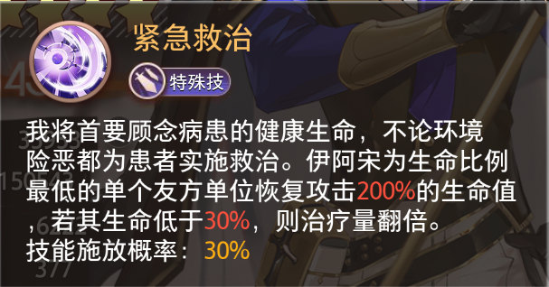 我将首要顾念病患的健康生命,不论环境险恶都为患者实施救治。伊阿宋为生命比例最低的单个友方单位恢复攻击200%的生命值,若其生命低于30%,则治疗量翻倍。