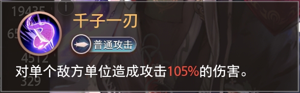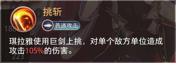 琪拉雅使用巨剑上挑,对单个敌方单位造成攻击105%的伤害。