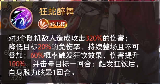 对3个随机敌人造成攻击320%的伤害;降低目标20%的免伤率,持续整场且不可叠加;60%概率触发狂饮效果,伤害提升100%,并击晕目标一回合;触发狂饮后,自身脱力眩晕1回合。