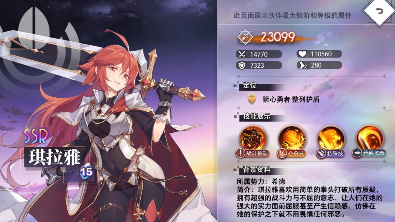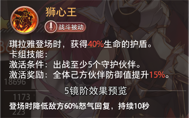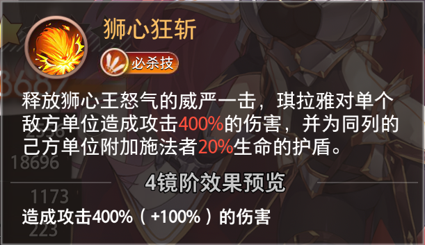 释放狮心王怒气的威严一击,琪拉雅对单个敌方单位造成攻击400%的伤害,并为同列的己方单位附加施法者20%生命的护盾。