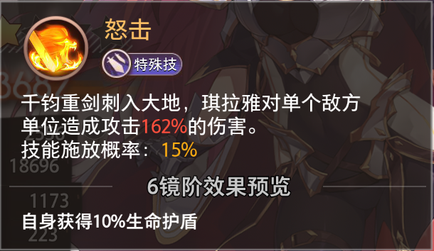 干钧重剑刺入大地,琪拉雅对单个敌方单位造成攻击162%的伤害。