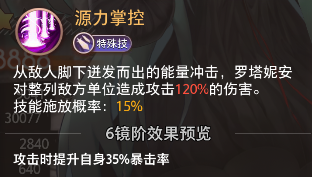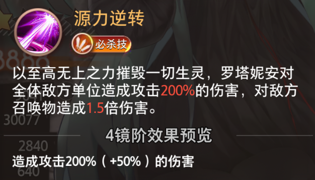 以至高无上之力摧毁一切生灵,罗塔妮安对全体敌方单位造成攻击200%的伤害,对敌方召唤物造成1.5倍伤害。