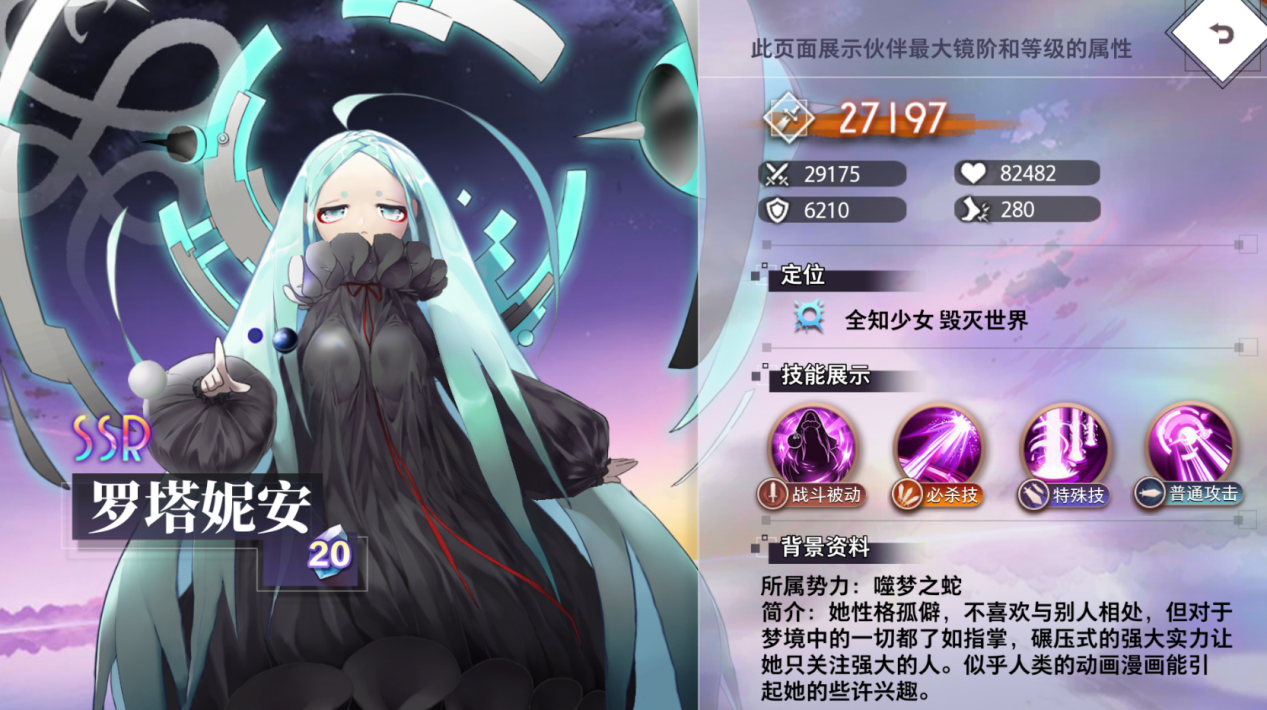 她性格孤僻,不喜欢与别人相处,但对于梦境中的一切都了如指掌,碾压式的强大实力让她只关注强大的人。似乎人类的动画漫画能引起她的些许兴趣。