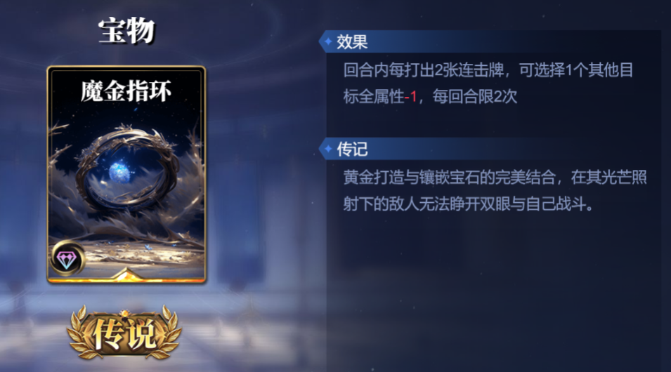 魔金指环的效果触发条件比较苛刻,需要打出2张连击牌才可选择一个目标全属性-1。