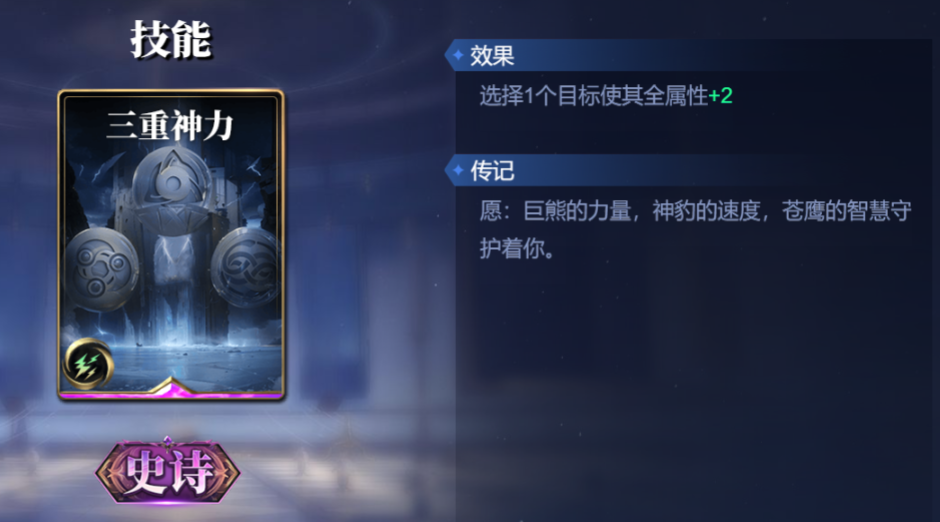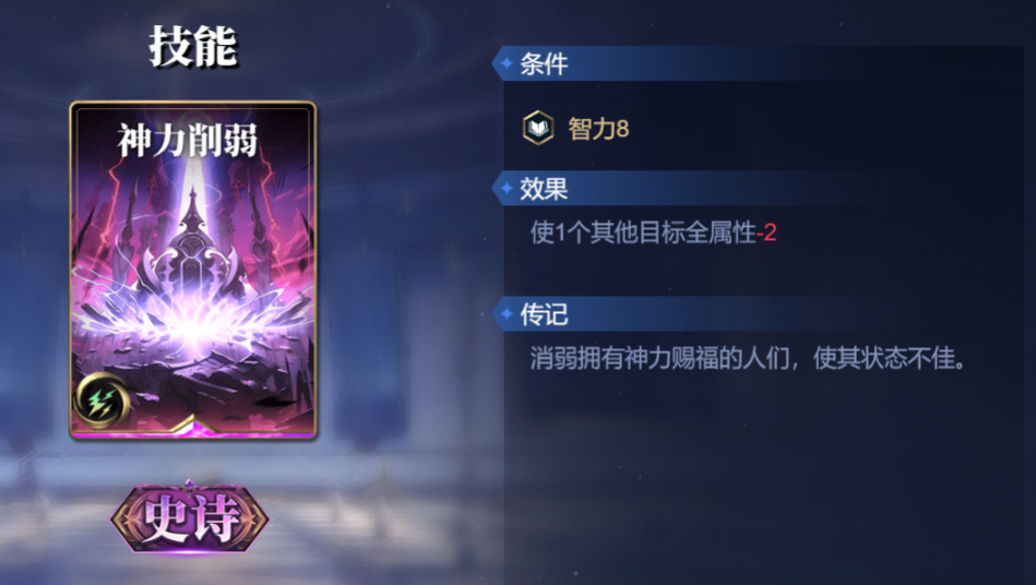 同时我们还可以携带神力削弱,直接降低对手2点全属性。只是神力削弱的使用条件需要8点智力属性,对于巴斯泰托来说比较难到达,就算携带了三重神力,还是会缺少2点智力属性,需要抽到智力牌来弥补。