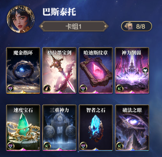 围绕巴斯泰托的技能特点,携带快速提升自己属性/减少对方属性的构筑卡形成属性压制是本卡组的核心逻辑。