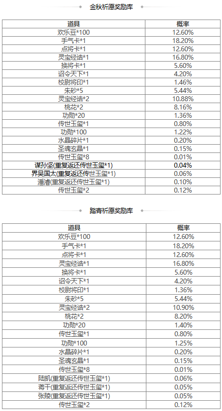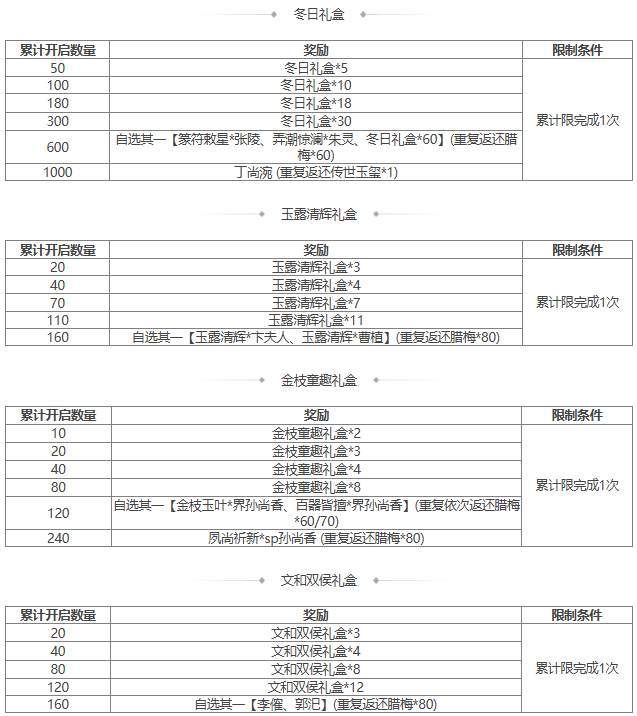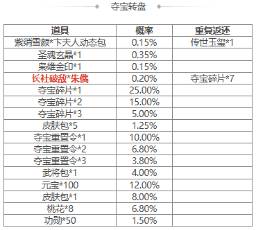 活动礼盒打开后,部分重复道具返还腊梅/夺宝重置券,具体详情见礼盒概率。