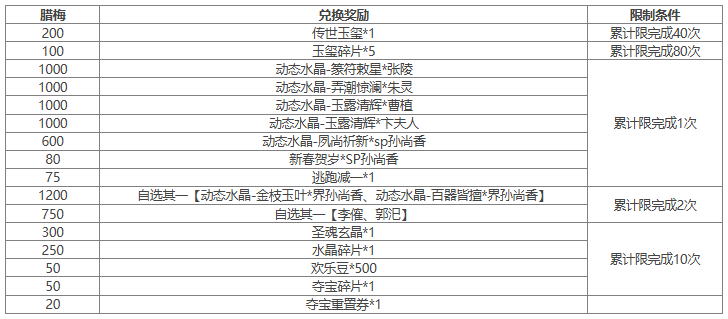 1、腊梅可兑换奖励,若兑换奖励是在此次活动前已拥有的永久武将、皮肤、三国秀,则无法重复兑换;