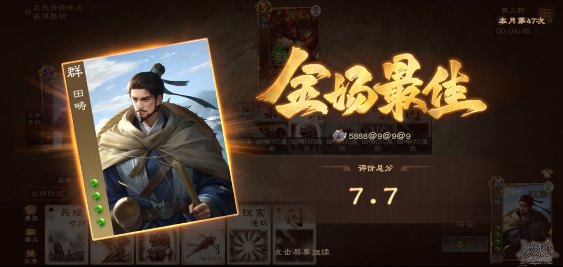 第二把是6号位的反贼身份,起手2杀1桃1酒。这里开局初步判断4号位钟琰反、七号位界吕蒙忠内。开局贾诩乱武,戏子选择杀主跳忠、谋姜维也对钟琰出杀跳忠、钟琰杀谋姜维,黄月英、田畴、界吕蒙、族荀谌选择失去一点体力。界贾诩的【乱武】杀选择杀钟琰,然后装备-1顺手界吕蒙、决斗钟琰,黄月英打无懈跳反,界贾诩反无懈收掉了钟琰。贾诩火攻自己过牌,然后杀族荀谌,族荀谌出闪【三恇】主公跳反,贾诩给了-1马和一张手牌,然后贴黄月英乐结束回合。戏志才使用南蛮入侵明确跳忠,谋姜维、界吕蒙变为2血,其余人响应出杀,戏志才装备-1马杀界黄月英打至1血结束回合。谋姜维拼点黄月英,拼点牌使用了桃,装备白银狮子然后使用双顺拿光了黄月英的手牌,使用南蛮入侵。黄月英濒死求桃,我出桃捞起。吕蒙打至1血,族荀谌打出无懈【三恇】谋姜维,其给出白银狮子+桃,戏志才判红,给主公摸2。因为断杀谋姜维也是装备了八卦阵结束回合。黄月英乐不思蜀判黑结束回合。我选择【善刀】我和族荀谌,压制他们顺便要收了黄月英和吕蒙。吕蒙濒死出酒自酒,戏志才掉血判黑丢吕蒙手牌,黄月英濒死选择不出桃让我收掉。发牌员也是眷顾我,让我摸到了铁索连环、红桃乐不思蜀、无中生有,无中生有也是摸到了桃和火杀。我也是铁索连环了吕蒙和戏志才酒火杀收掉了他们,翻开身份是俩忠,谋姜维为内,我也是贴贾诩乐结束回合。族荀谌装备白银【三恇】谋姜维,拿到了姜维的最后1手牌+八卦阵,杀贾诩、吃桃、贴谋姜维乐结束回合。贾诩天过,铁索我和荀谌,顺手被荀谌无懈,【三恇】拿回谋姜维手里的白银狮子,贾诩结束回合。谋姜维中乐,拼我雷杀打中。到我回合手里3杀一刀,在我知道荀谌大致手牌后也是【善刀】了我的杀和他的-1马,防止荀谌回合内断杀。贾诩万剑出闪,我出杀打中贾诩,此时贾诩3血1牌我结束回合。荀谌也是出杀贾诩、装备白银控了他们俩手牌,装备八卦阵结束回合。贾诩使用了南蛮入侵,谋姜维俩血,荀谌帮我打无懈可击【三恇】贾诩,其给出了一闪装备白银狮子结束回合。谋姜维拼点失败出杀,回合结束使用限定技获得了双招,继续拼点把我打至俩血0牌。我的回合摸到了俩杀也是继续【善刀】递杀拿了荀谌的八卦阵,万剑+杀将贾诩打至1血,结束回合。荀谌也是补刀收掉了贾诩,最终取得了胜利。