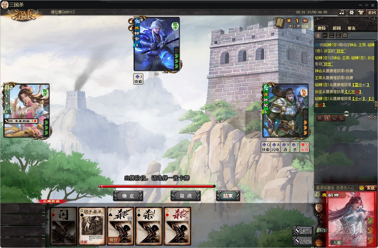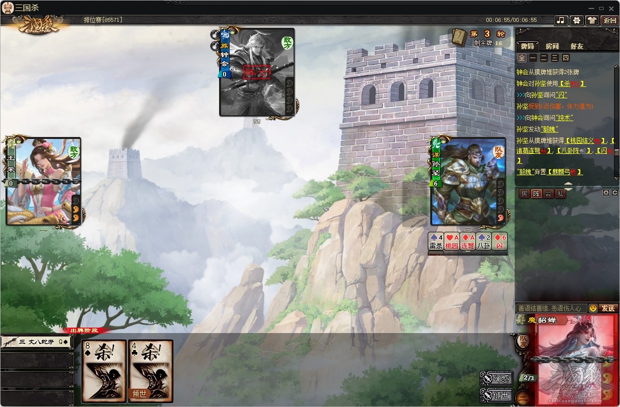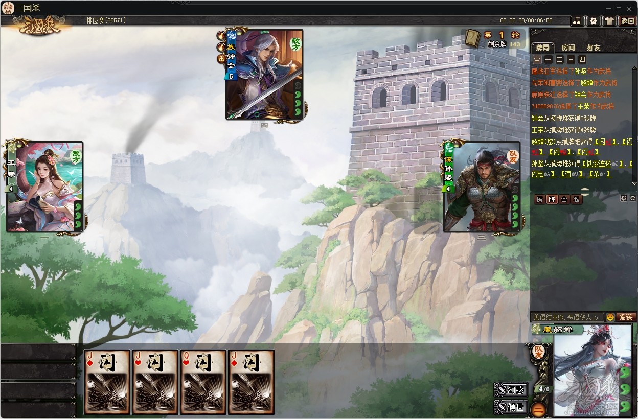 本局游戏我方阵容为2号魔貂蝉、3号谋孙坚,对方阵容为1号王荣、4号族钟会。