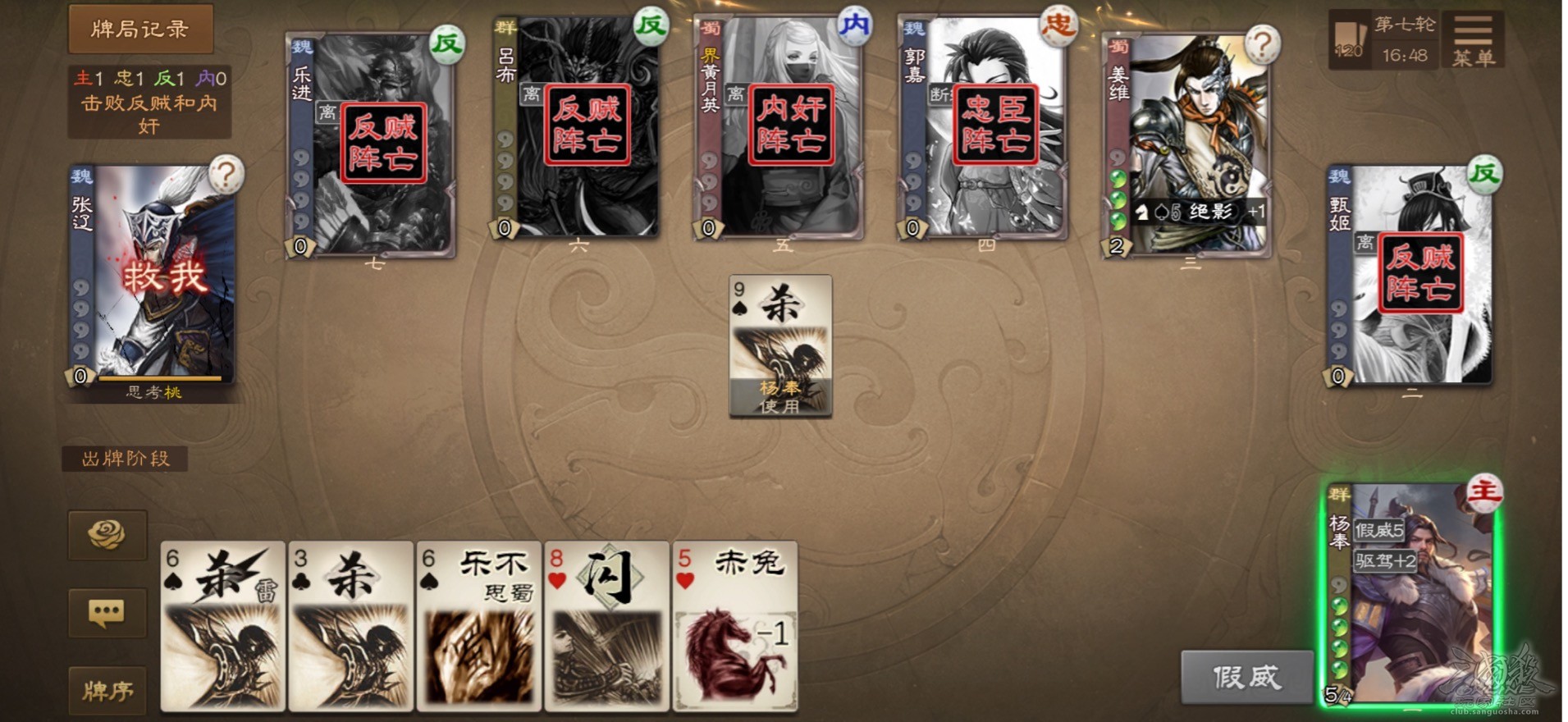 由于是主公,我可以发育到弃5摸6的状态,于是抓住机会打了一波击杀滚雪球。但是有一回合因为没计算好伤害,丢掉了二技能。