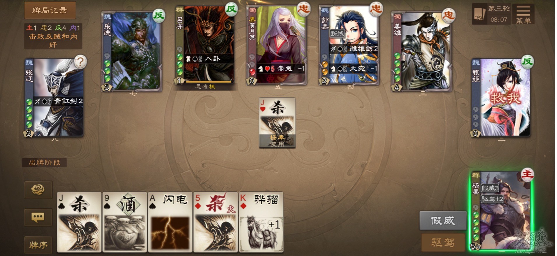 四、牌局讲解这是一盘军八身份场,我作为主公选择了杨奉。然而开局忠臣郭嘉逃跑,姜维位置差近乎白板,黄月英受到反贼方集火。我只能苟住发育,这是发育了3轮后的结果: