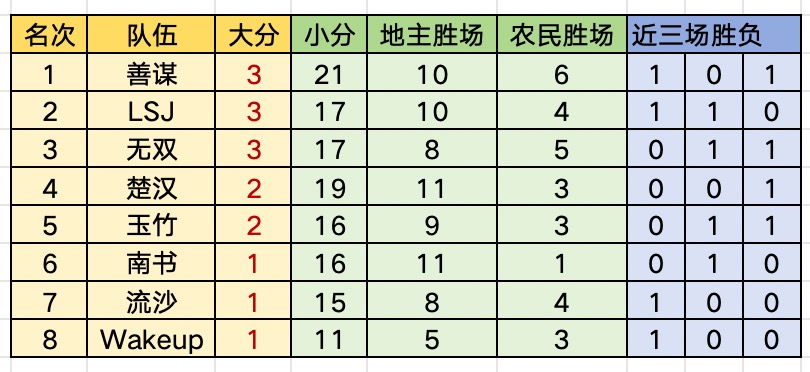上周的比赛为我们带来了八场精彩纷呈,又强弱鲜明对抗。无双先是击败了超级强队善谋,然后又在BP掉线的不利局面下,通过布局农民武将,反杀张璇,陈式,以白马偷渡战胜了流沙。玉竹也一洗两连败的耻辱,先后战胜楚汉和LSJ,攀升到了积分榜第五的位置。