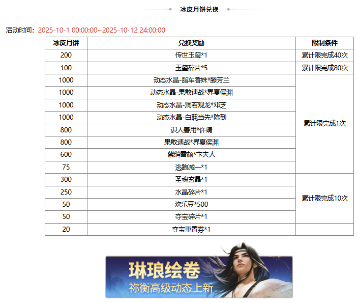 2、冰皮月饼 2025-10-11 00:00:00 到期,到期自动删除不回收。传世玉玺未消耗的可用于下期活动;