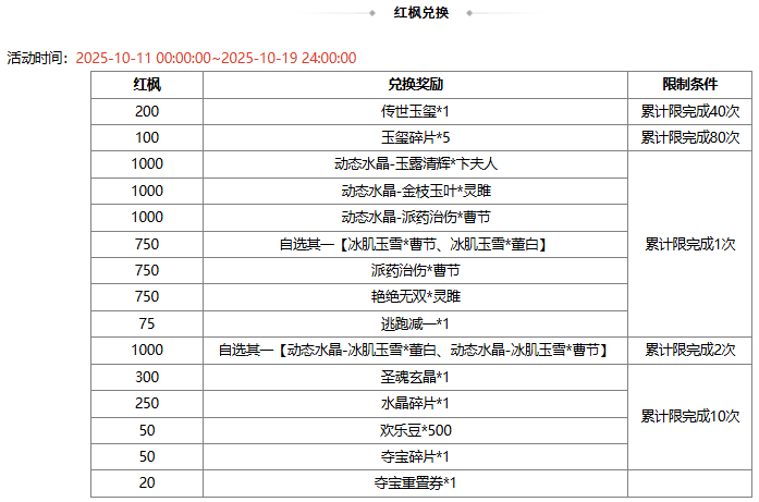 2、红枫 2025-10-19 24:00:00 到期,到期自动删除不回收。传世玉玺未消耗的可用于下期活动;