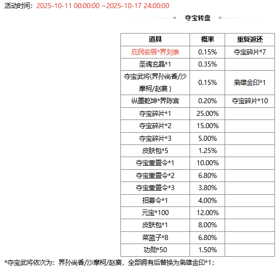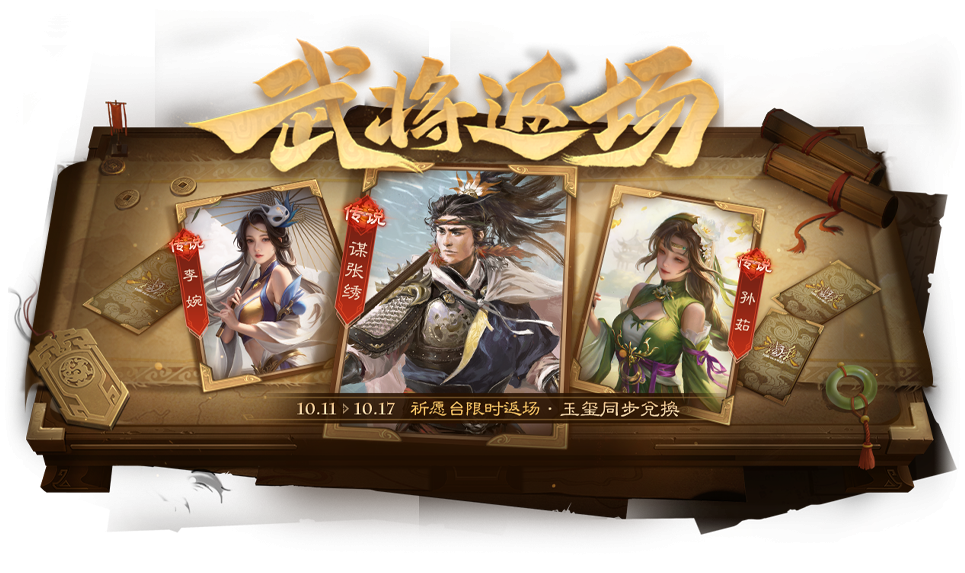 *本期返场春福龙珠活动(谋张绣)、夏至龙珠活动(李婉)、七夕龙珠活动(孙茹),龙珠可购买时间:2025-10-11 00:15:00~2025-10-17 24:00:00;