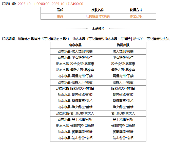 *2025-10-11 00:00:00 ~2025-10-17 24:00:00,庇民安居*界刘表 70夺宝碎片、纵墨乾坤*界陈宫 100夺宝碎片 限时上架夺宝商店。2025-10-18 00:00:00 起,庇民安居*界刘表、纵墨乾坤*界陈宫 下架。