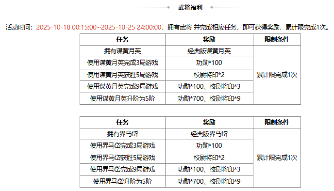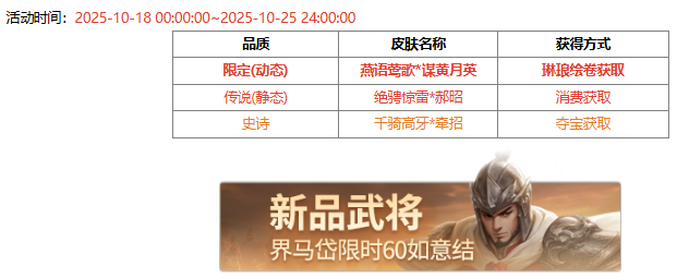 *本期返场 25夏日龙珠活动(界曹植)、立冬龙珠活动(谋华雄)、闪闪龙珠活动(谋袁绍)、中秋龙珠活动(界张春华),龙珠可购买时间:2025-10-18 00:15:00~2025-10-25 24:00:00;