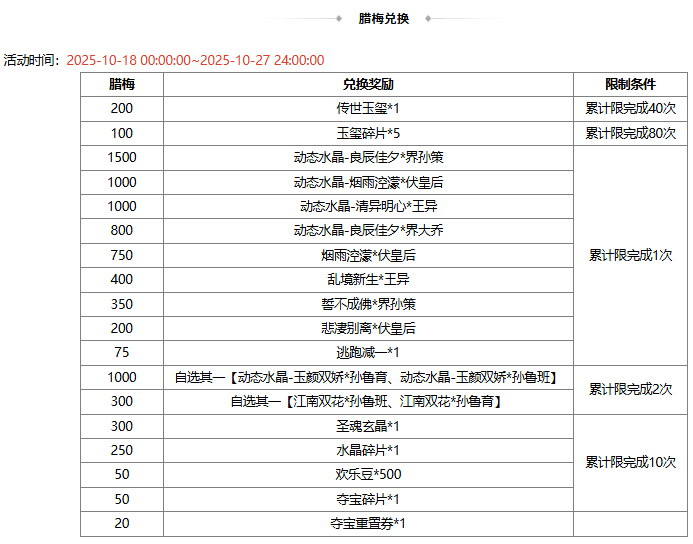2、腊梅 2025-10-26 00:00:00 到期,到期自动删除不回收。传世玉玺未消耗的可用于下期活动;