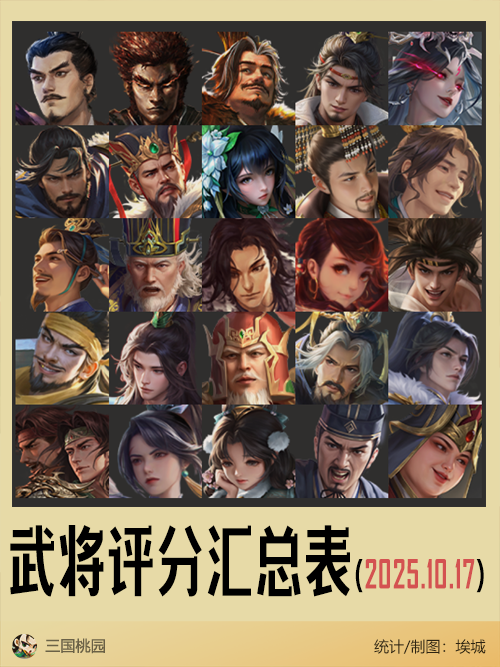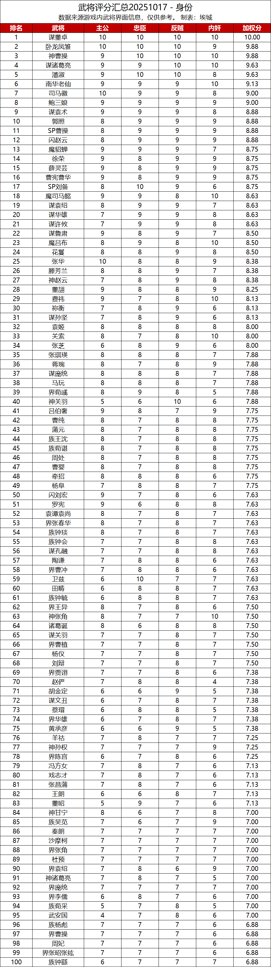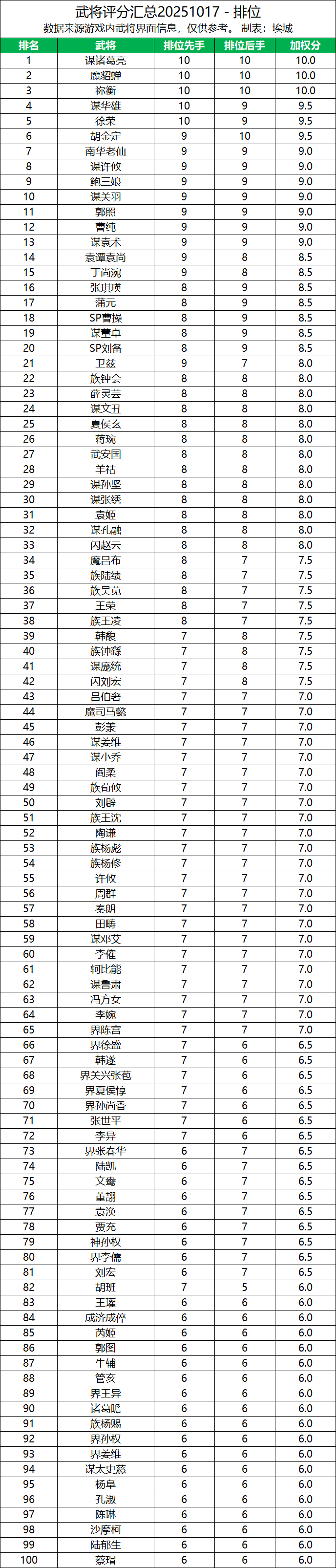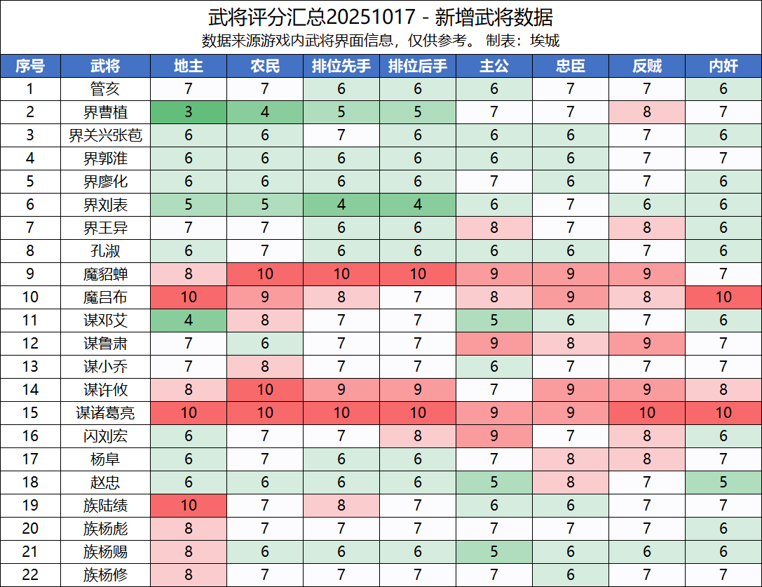 上一期汇总评分贴是今年5月发的,与之相比,最新版数据增加了22名武将的评分数据,包括国庆最新上线的谋诸葛亮、谋鲁肃。