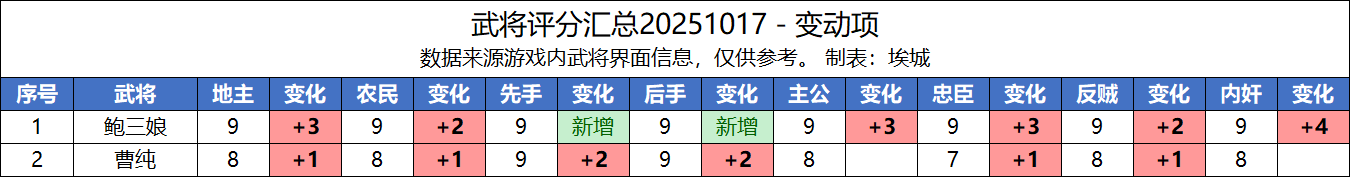 比较遗憾的是,仅有两名武将的评分数据发生了变动:曹纯、鲍三娘,均为技能修改的大祈福。实际上随着环境变化,新的强将不断涌现,应该是会有部分老武将强度出现较大变动的。但可惜目前没有看到官方更新相关评分配置。当然,这工作量确实不小,只能默默期待了