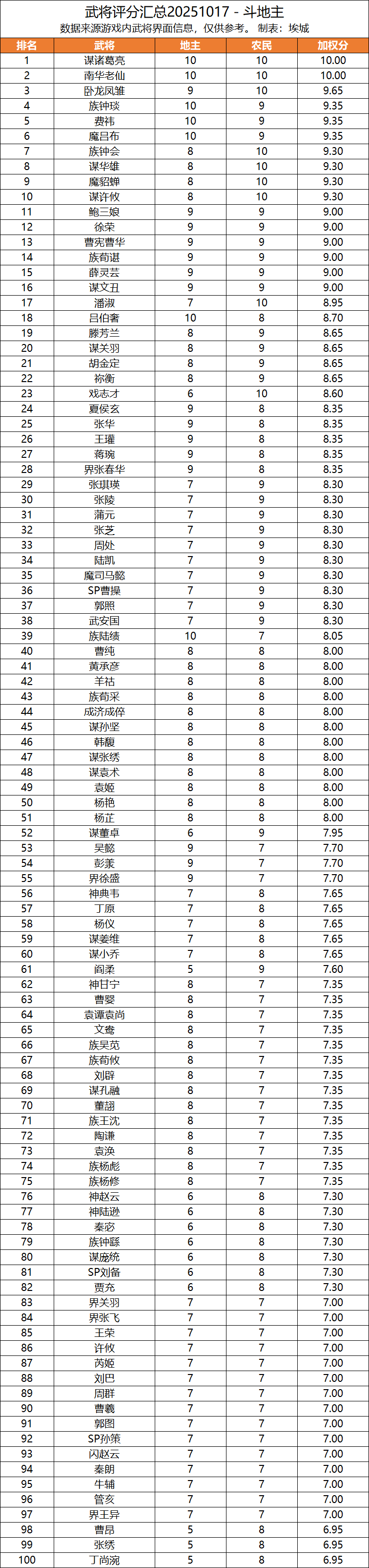 斗地主模式按照( 地主评分*0.35+农民评分*0.65)的公式计算加权分。谋诸葛亮成为第二个地主/农民双10分武将。而斗地主玩家应该都知道,上一个双10分武将南华老仙,由于天书概率暗调,目前发挥已经远不及当初,实际强度肯定下滑了。