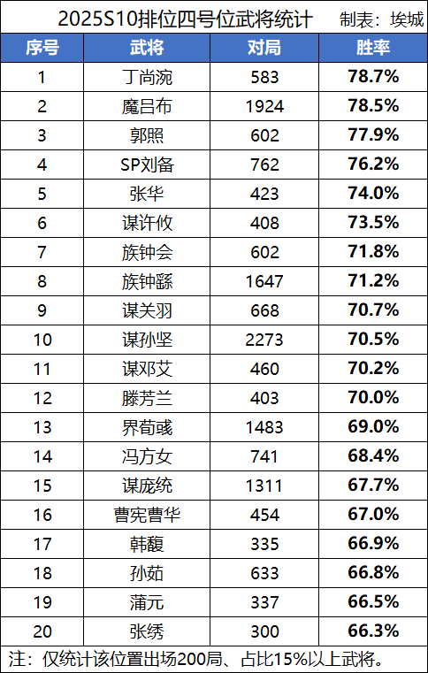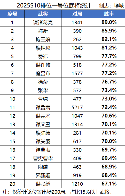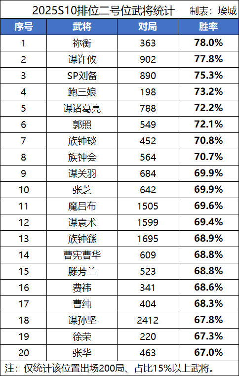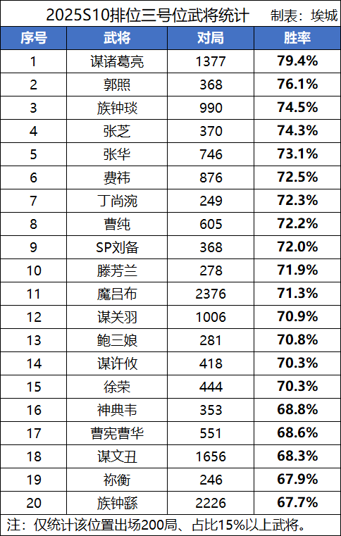 最后看下各个位置的武将数据。本部分仅统计该位置出场200局以上且占比15%以上武将。