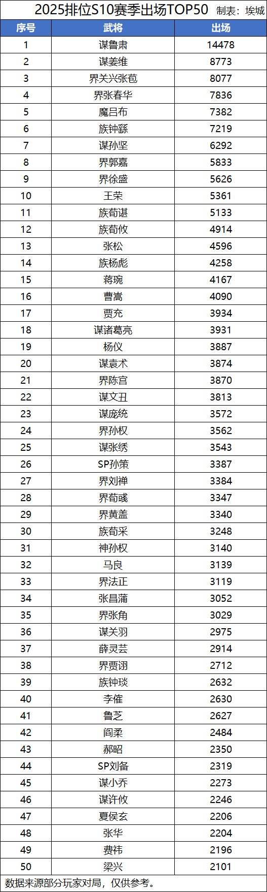 谋鲁肃凭借不错的强度和机制以及体验卡优势,出场断档第一。界关兴张苞也人气颇高,出场排第三。界张春华、谋孙坚、界徐盛由于1~8日限免且高出框(甚至频繁出现在系统推荐里),导致出场量相当高。但整体而言,强将的出量大幅降低,不少玩家反馈自己的将框仿佛回到数年前。