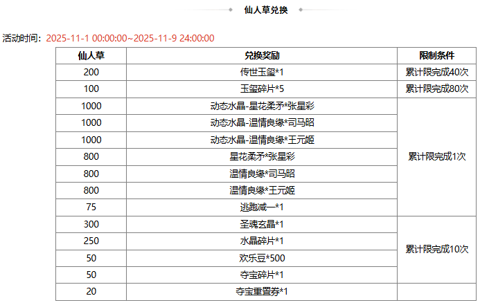 2、仙人草 2025-11-10 00:00:00 到期,到期后按照200仙人草兑换1传世玉玺过期替换,不足200部分自动删除不回收。传世玉玺未消耗的可用于下期活动;