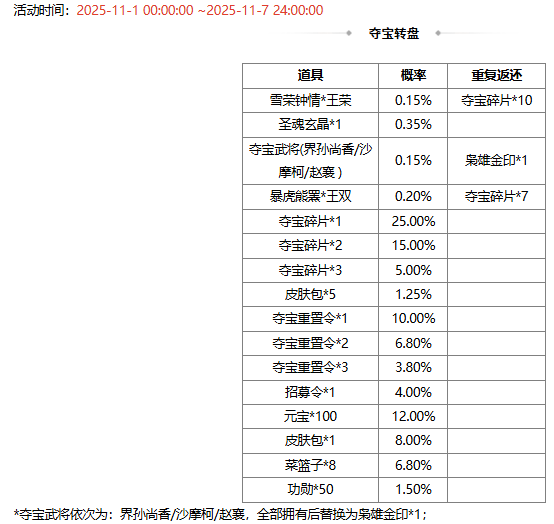 *本期返场元旦龙珠活动(SP曹操)、乞巧龙珠活动(谋小乔)、闪耀龙珠活动(闪赵云)、红枫龙珠活动(族荀谌),龙珠可购买时间:2025-11-1 00:15:00~2025-11-7 24:00:00;