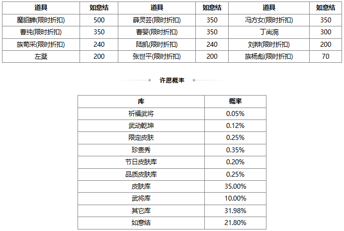 1、如意结可在立冬许愿中兑换奖励,若兑换奖励是在此次活动前已拥有的永久武将、皮肤、三国秀,则无法重复兑换。