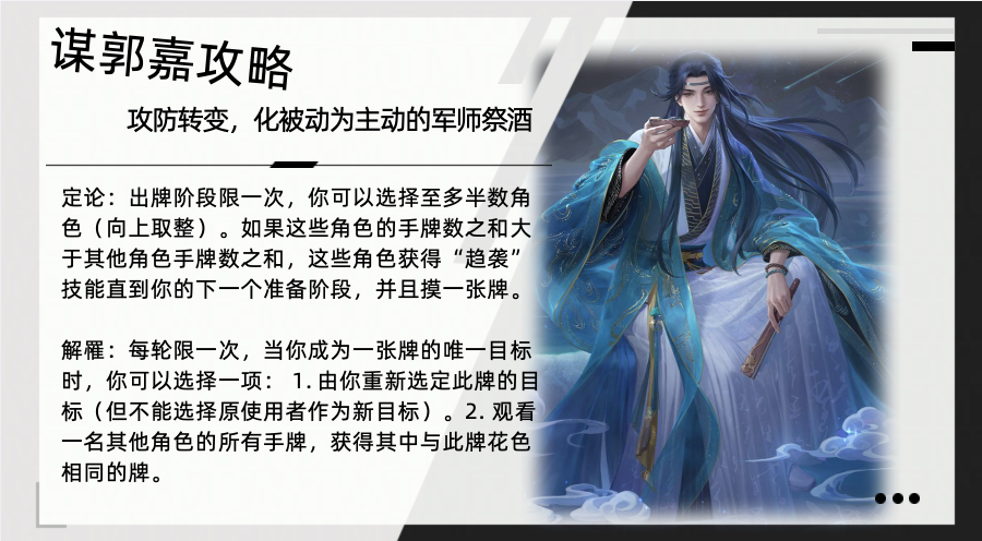 · “定论”能显著增强团队控制能力,让队友获得“趋袭”和摸牌,形成手牌优势和场面控制。有谋郭嘉在团队时,整个团队都需要尽量保持手牌厚度,以稳定触发“定论”的发动条件。