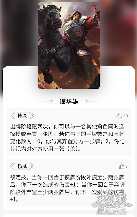 1.配合能让华雄额外摸牌的武将(这里是额外摸牌,摸牌阶段和交给手牌是不算的),如sp刘备,谋孙坚,(族)钟繇,藤芳兰,刘宏,杨彪,杜预,.......这里比较推荐刘宏,sp刘备和谋鲁肃,刘宏配合华雄多刀过牌量还是很大的。谋鲁肃自身强度也很强,配合华雄加伤打死一个很容易。sp刘备就更不用说了,补牌喝酒机制能让华雄更加强势。