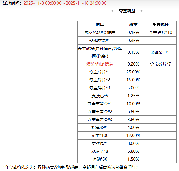 活动礼盒打开后,部分重复道具返还银杏/夺宝重置券,具体概率详见概率公示。